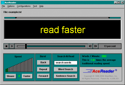 Productivity/Educational Self-Improvement Reading Software. Speed Reading Software. Read faster while on your computer by reading in Rapid Serial Visual Presentation (RSVP) mode. In RSVP mode the words come to your eyes instead of your eyes going to the words. Learn to read faster both on and off your computer by practicing to read in RSVP and Tachistoscopic Scroll mode at configurable speed settings. In Tachistoscopic mode, your eyes are forced to move in normal fashion but at preset speeds. Comes complete with reading/comprehension tests that are broken out by grade levels. Test results are logged on a per user basis and can be viewed graphically. Designed for use by all ages (from the high powered executives that needs to read faster in todays information age, to children just learning how to read). Can be used to rapidly read and skim text found in documents and your clipboard. Using the clipboard allows for reading text from other applications like your favorite word processor and text from the Internet (i. e. web pages, email, news groups... ). Many options: set font, set background color, set mode (Center Text, or Eye Trainer Scroll), number of words or lines per flash, column width, set delays (if certain punctuation or long words are found), set burst reading lengths. Main screen allows for setting current document position, setting speed, burst back/repeat/forward, Search-N-Read options, and displays your last reading speed. Includes online help.