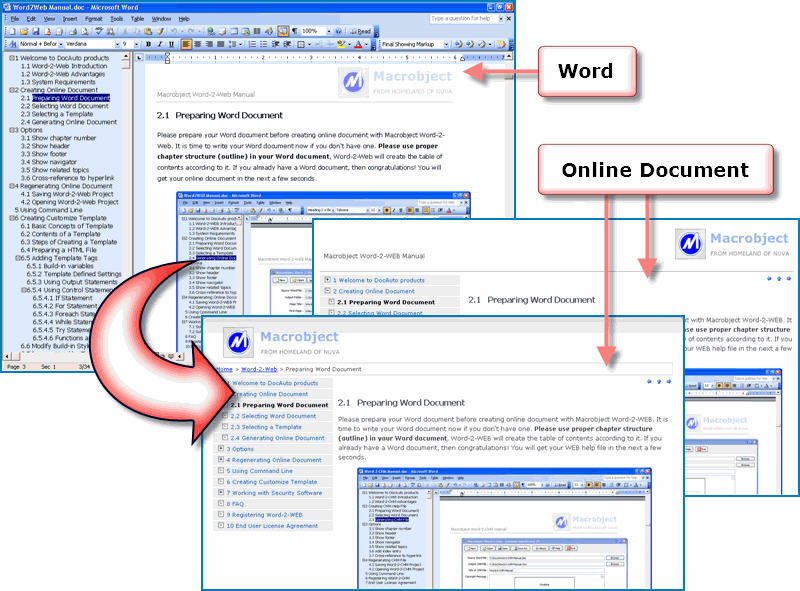 A powerful Web online document creator/generator help you to create professional HTML online document and web help. Convert Word document (. doc,. rtf,. htm, etc. ) to perfect online Web help and full fit for your web site. Make online help to be integrated into your web site in seconds with a single click. Keep the format/style/layout (include images and tables) of the original Word document. Create topic tree according to the outline of the Word document.