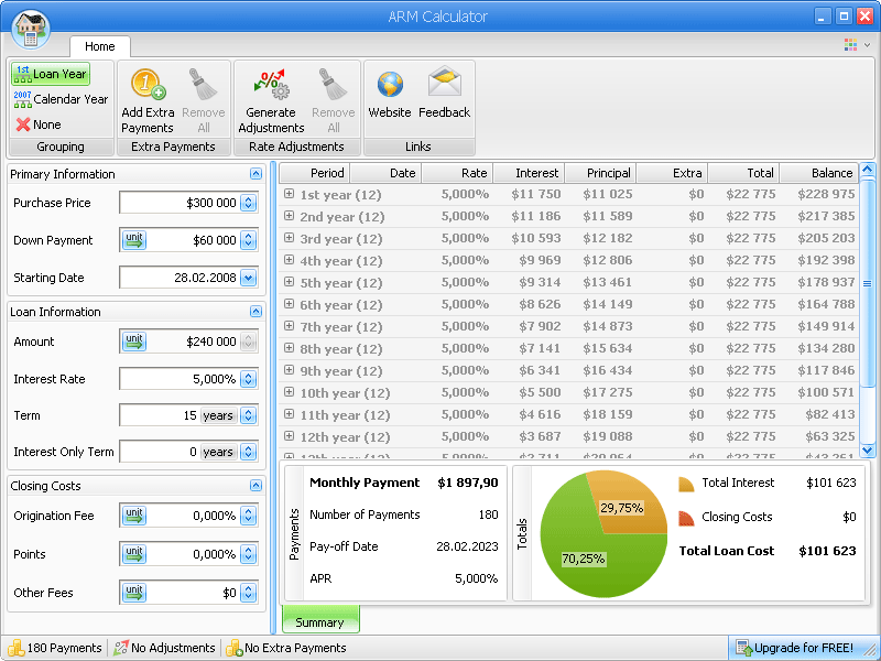 This program provides you with a month-to-month report about your repayment progress detailed with information about the rate, the principal and the interest payments, the extra payments, the totals per year, and the balance. The effect of the adjusted interest rate or extra payments will be immediately noticeable in the dynamically updated fields of the report. Fixed rate, adjustable rate and interest-only mortgages can be analyzed to their full extent, including the annual percentage rate.