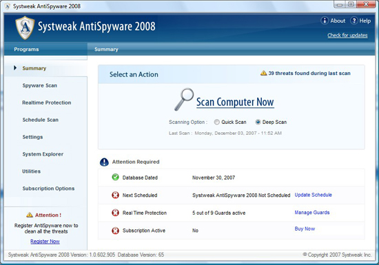 This program is a solution to check all the malicious programs intruding your computer. It is a true protection guard against the deceiving applications that take the form of startup programs, cookies, registry entries, and files and folders to hide themselves in your system. Check for infections at all potentially dangerous areas and safeguard all your hard work and tons of information. With the vast database of spyware detections you can efficiently control low-risk annoying pop-up adverts to high-risk infections that can steal confidential data to severe-risk malware that can even format your system in stealth mode.