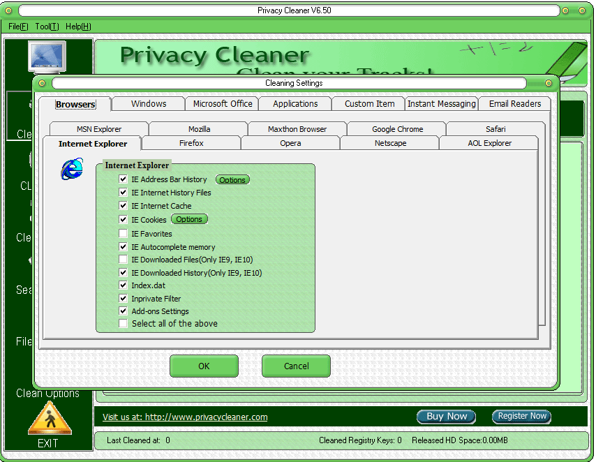 This program Development is designed to protect you by cleaning up all the unwanted history data on your computer. With simply one click, This program Development allows you to erase the cache, cookies, history, typed URLs, autocomplete memory, and Windows temp folder, run history, search history, open/save history, recent documents, etc.