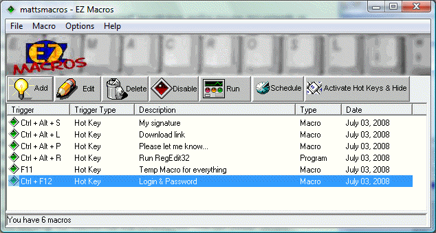 It may "record" keystrokes and/or computer mouse movements or macros may be created and modified manually. You can handle tasks with just the few keystrokes and 100s of possible macro very hot keys are available. This program Development features both global plus program-specific macros. "Global" macros may be used with all your own programs, while "program-specific" macros work only with specific programs. Tired of keying in in the date upon documents! Just create the macro that puts the particular date set for you. Discover yourself always utilizing the exact same 3 programs on the certain project! Create a macro that launches all associated with them with an easy keystroke! When you create or even edit a macro, This program Development lets you insert breaks, delays, sounds, date, period, and much more! With the FREE OF CHARGE companion program, EZ Scheduler, macros could be scheduled in order to run at Windows load, once, hourly, daily, every week, and monthly. On the web a person can launch your e-mail program or go in order to your preferred web sites simply by hitting an easy keystroke.