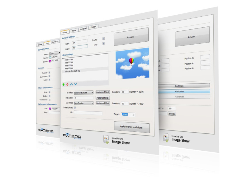 Main product features: Easy and Intuitive User Interface; Background sound option; Shape enhancement options; It increases your productivity; Easy to integrate in HTML (fully integrated in Dreamweaver); Compatible with all popular browsers; No coding required; Unlimited number of domains License; Amazing Effects; Background options; Visual picture order or shuffle mode; Over 20 transition effects; Integrated Preview Mode (Windows and Mac); Works with the latest Dreamweaver releases; Save Load = Reuse; IE FLASH problem solved.
