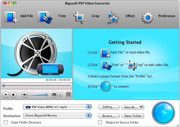 Furthermore, the powerful Mac PSP movie converter is equipped with advanced editing functions, which helps to preview before converting, capture the images in preview, rip any movie segment, crop black margin, automatically shut down Mac OS after conversion, convert files in batches, merge several movies into one, and much more.