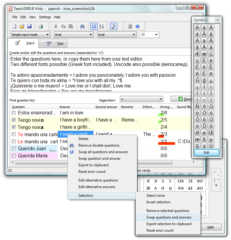 This program is a private teacher to help you memorize a foreign language, topography or even the history of Italy by dates. Improve your school results with this free language trainer. Many ways of testing. Examples. Two or more different answers possible. Multi-line questions/answers. Full Unicode support, ancient Greek font included. Dictionaries included. Easy input of special symbols. Record the questions and play them while testing. Predefine multiple choice- or yes/no-questions. Print a crib note.