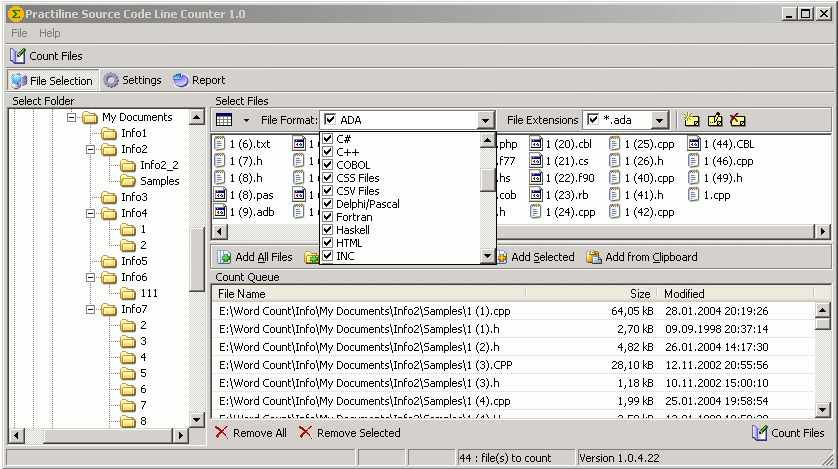 Capability to easily add fresh file formats and determine count rules and remark types. Extremely fast -- counts entire projects within no time.