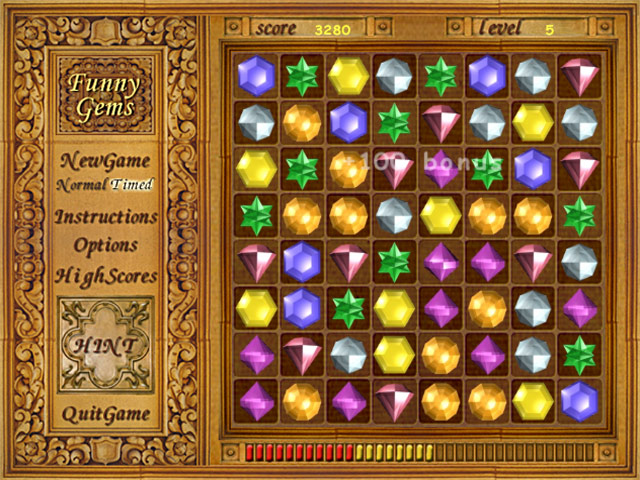 Destroy gems to create rows of three in this original and addictive puzzle game with calm pleasant music. You can play two game types: Normal and Timed. Normal game offers a click count control; play level after level and train your brain skills! Timed game has a period limit; create rows as fast as you can! This humorous game is easy to learn, fun to play.