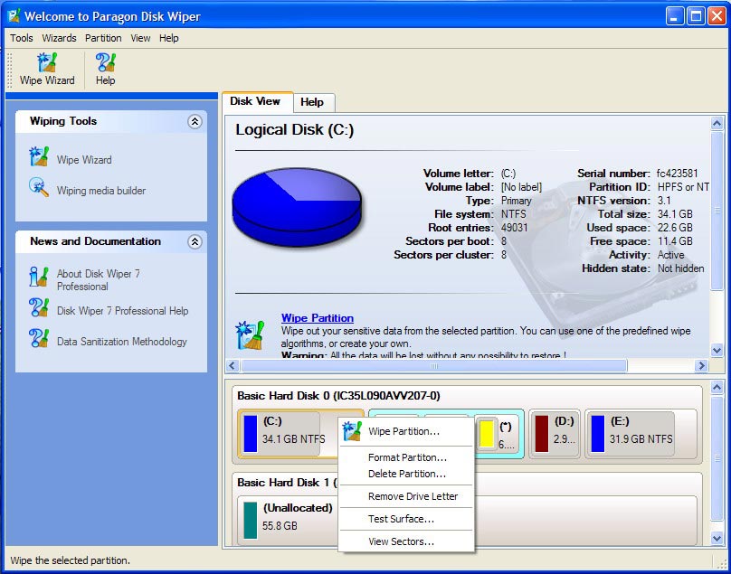 Make sure that no-one can recover sensitive data you thought was deleted! Securely erase your data held on your hard disk with This program . This is essential for any disk, as data is too easily recovered if you rely on the standard delete function or formatting your hard disk. Paragon Disk Wiper can completely erase a whole hard disk or partition, or delete just the sensitive files scattered around your system. It guarantees secure and easy erasure of your critical data with the powerful algorithm and customization option, wizard-based interface and extensive reporting. You can irreversibly destroy all on-disk data easily and quickly, so as it cannot be recovered with any present-day technology. Key features and benefits: - User friendly interface - Graphic representation of the actual layout of the hard disk system - Wiping of hard disks/separate partitions (primary, extended, logical) - New Paragon developed algorithm - Create your own wipe algorithm with minimal effort - In-depth report on the accomplished wipe operation with the option to print it out or save locally - Logging of bad blocks (corrupted sectors) discovered during the operation - Basic partitioning operations (create, delete, format)