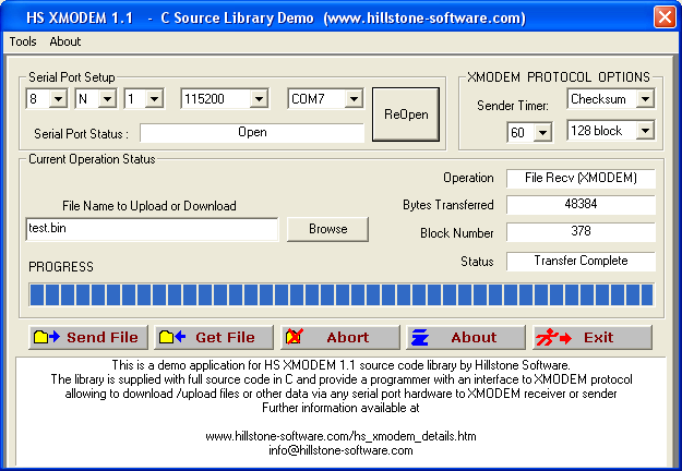 - HS XMODEM Demo Application binaries, full source code and MS Visual C project workspace.